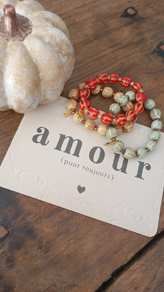 Apportez une touche de couleur et d’originalité à votre poignet avec nos bracelets élastiques en perles de céramique de forme citrouille.Chaque perle est unique, offrant de magnifiques nuances naturelles, associées à une petite étoile dorée pour une finition élégante et lumineuse.