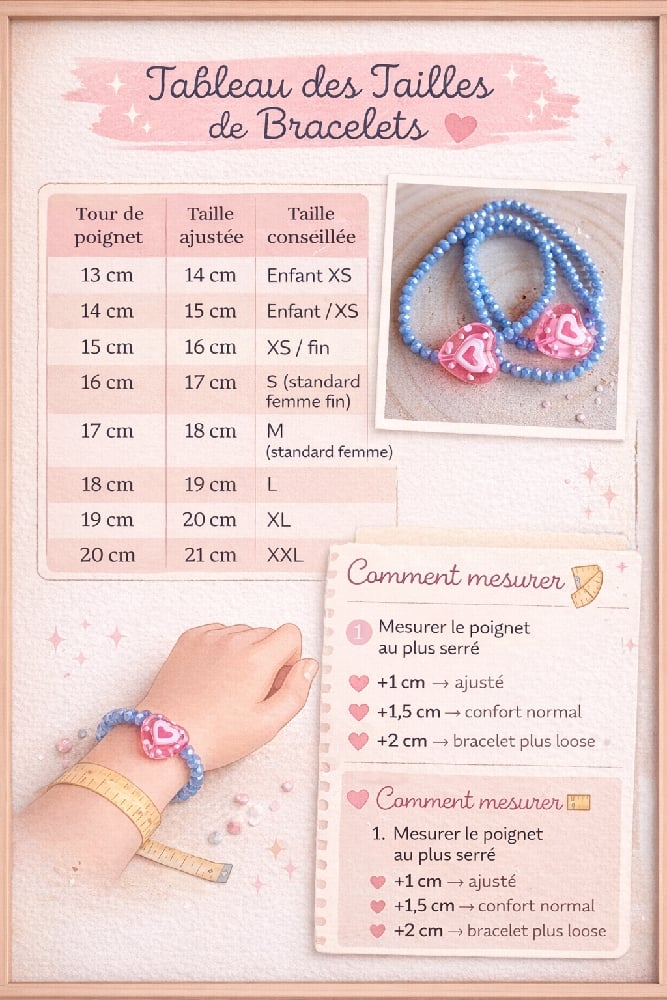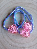 Bracelet délicat composé de perles facettées bleues lumineuses et d’un joli cœur rose plein de douceur.