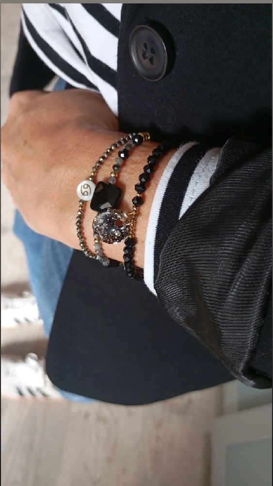 Le bracelet Gaspard avec sa nouvelle médaille en paillettes et ces minis perles en hématite,qui vous apportera apaisement et purification .