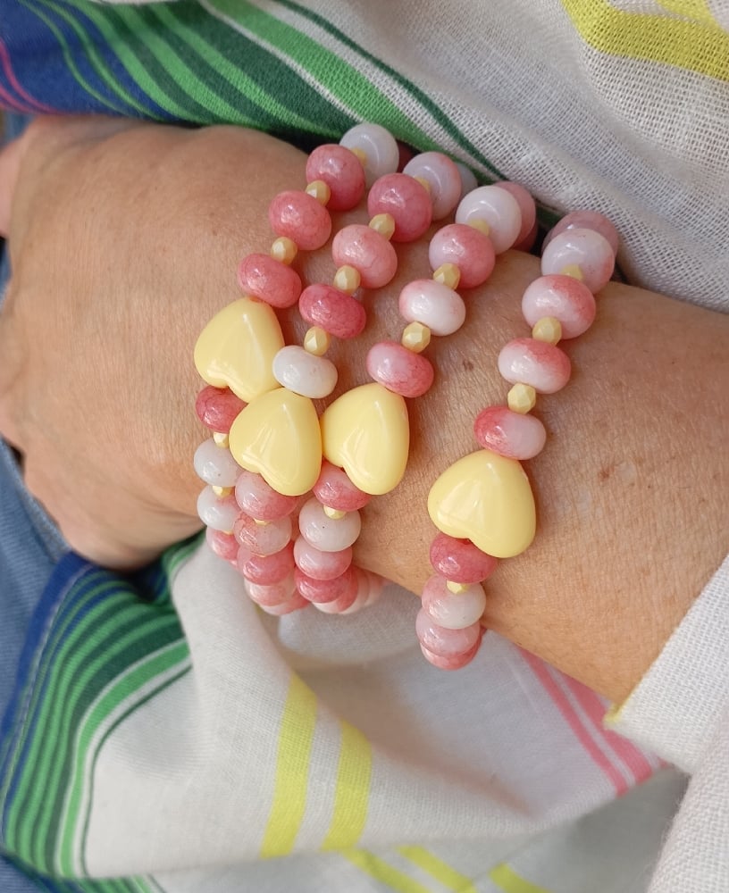 Un mélange de tendresse et de lumière, comme ces perles aux nuances rosées et ce cœur jaune tout doux.